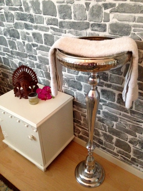 Ik masseer de rug en de achterkant van de benen met een voedende olie waarin grof zeezout is verwerkt. Het effect is een gereinigde zijdezachte huid!